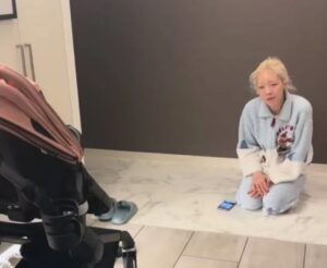 ベビーカーに乗った生まれたばかりの我が子を愛おしそうに見つめるスッピン姿のちゃんみなさん。