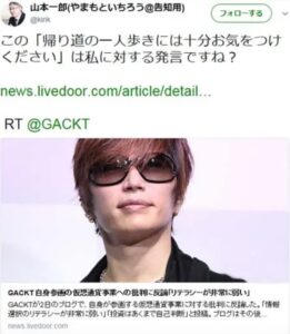 ちなみにGACKTさんと山本一郎さんは過去に食事や麻雀をした仲で、『帰り道の一人歩きには十分お気をつけください』という一文は顔見知り故のジョークだったと説明し、大ごとにはなりませんでした。